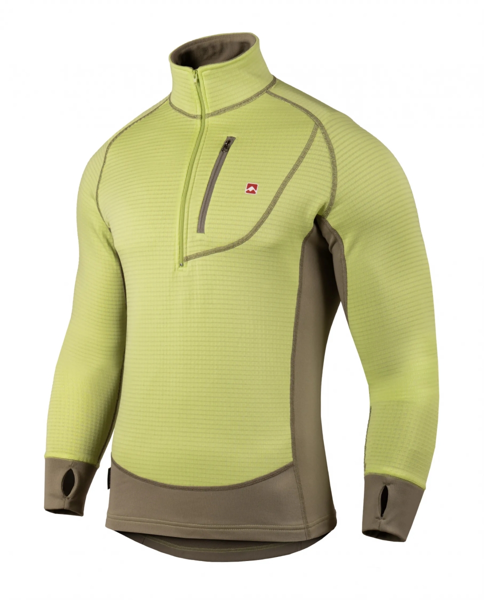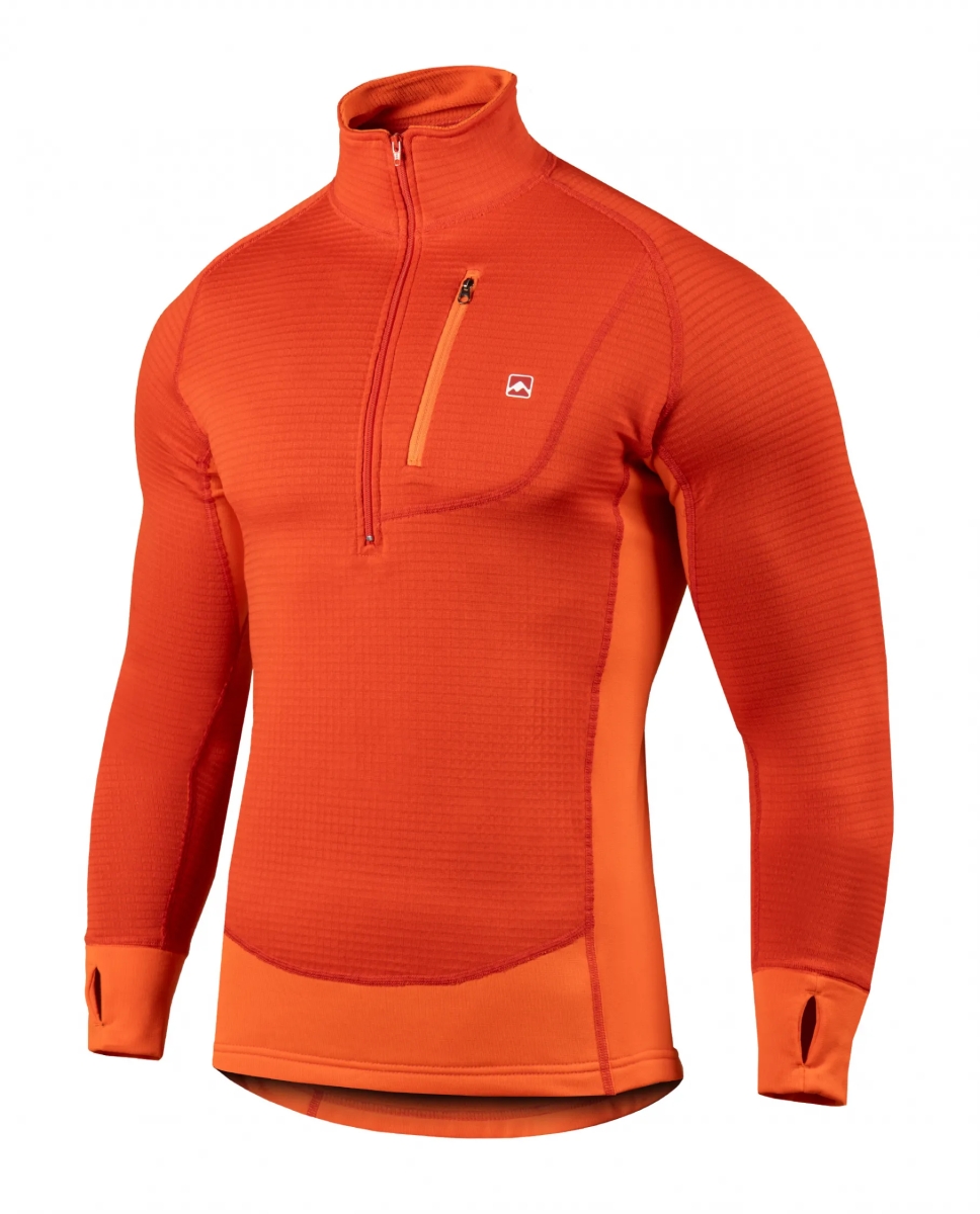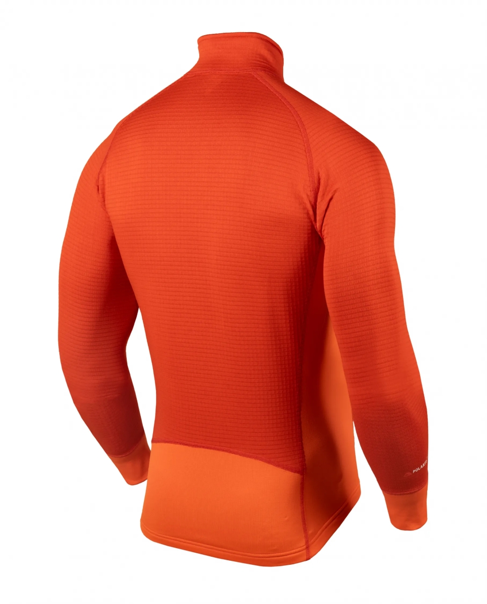 Tejidos combinados funcionalmente: uno de mayor capacidad de abrigo (POLARTEC® Power Dry® Haevy) para todas las zonas más vulnerables al choque de frío; y otro más fino y elástico (POLARTEC® Power Dry® Midweight) para zonas que necesitan mayor ventilación, movilidad y menos volumen de tela. Dicha combinación hace a esta prenda muy versátil, ideal para toda actividad aeróbica en climas fríos pudiendo ser usada como única capa o como primera capa en caso de requerir más abrigo. Además estos tejidos cuentan con un porcentaje de fibras recicladas, y el tratamiento Odor Resistant que reduce los malos olores. Esta versión cuenta con pasapulgar en los puños y un bolsillo en el frente de rápido acceso para guardar elementos pequeños, además el nuevo corte le brinda un estilo más estilizado. En el modelo masculino se reduce el corte frontal aportando un calce con mayor confort.