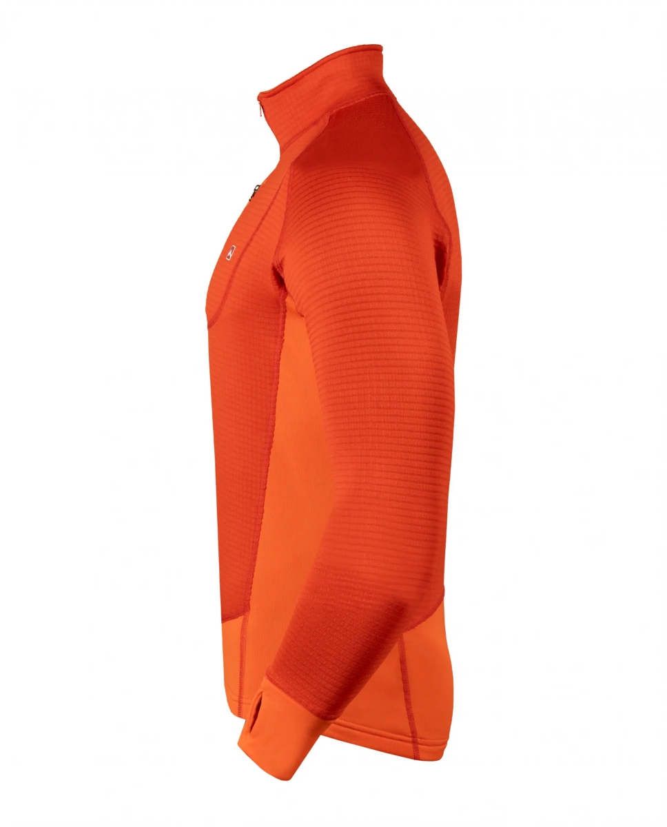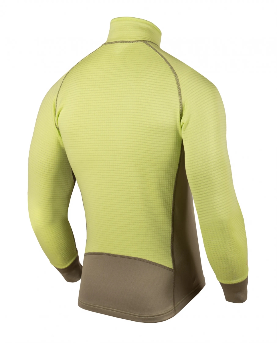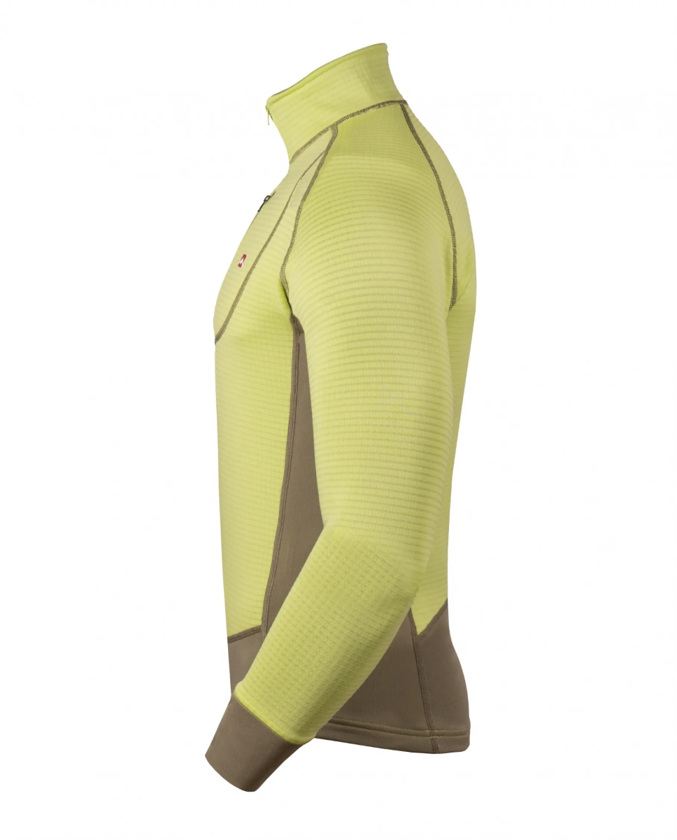 Tejidos combinados funcionalmente: uno de mayor capacidad de abrigo (POLARTEC® Power Dry® Haevy) para todas las zonas más vulnerables al choque de frío; y otro más fino y elástico (POLARTEC® Power Dry® Midweight) para zonas que necesitan mayor ventilación, movilidad y menos volumen de tela. Dicha combinación hace a esta prenda muy versátil, ideal para toda actividad aeróbica en climas fríos pudiendo ser usada como única capa o como primera capa en caso de requerir más abrigo. Además estos tejidos cuentan con un porcentaje de fibras recicladas, y el tratamiento Odor Resistant que reduce los malos olores. Esta versión cuenta con pasapulgar en los puños y un bolsillo en el frente de rápido acceso para guardar elementos pequeños, además el nuevo corte le brinda un estilo más estilizado. En el modelo masculino se reduce el corte frontal aportando un calce con mayor confort.