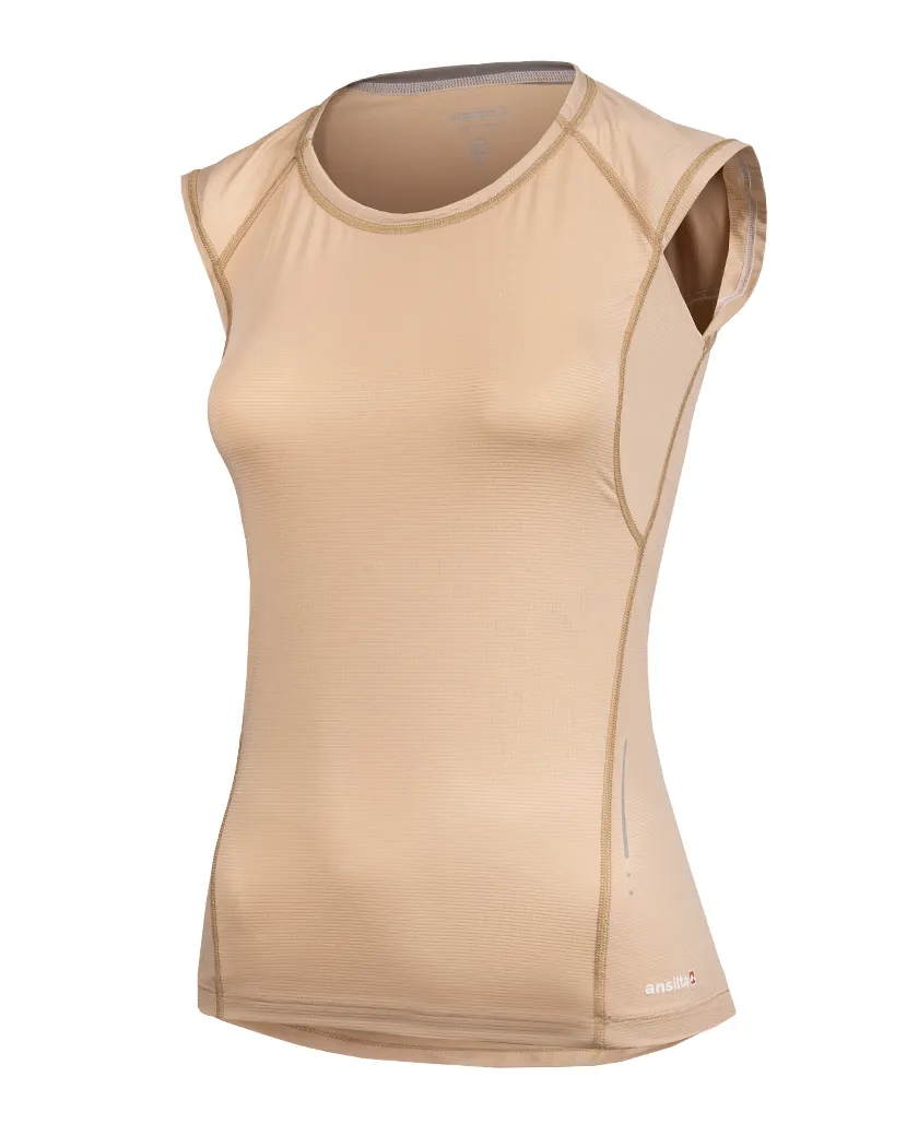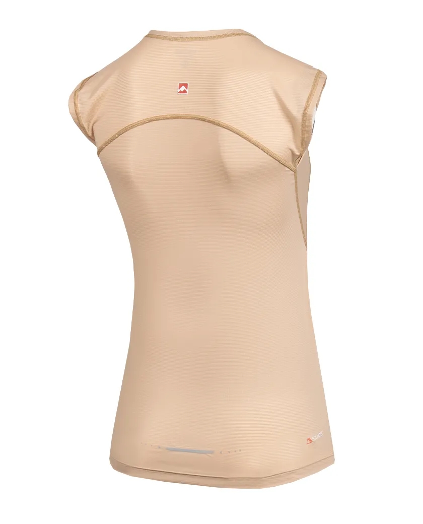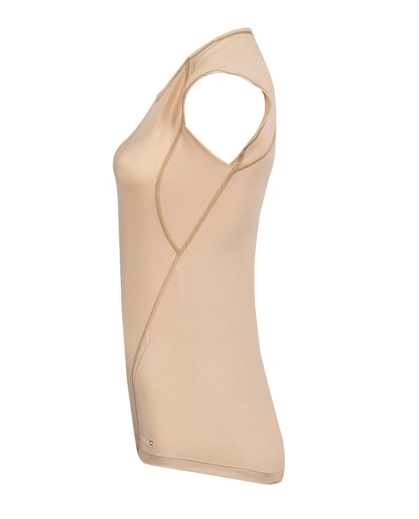 Remera sin mangas para mujer, con hombros y espalda cubiertos para evitar el contacto de las mochilas o chalecos de hidratación con la piel. Recorte lateral sin costuras, con tela doble, para que el roce de los brazos al correr sea más suave y así evitar que las costuras irriten la piel.